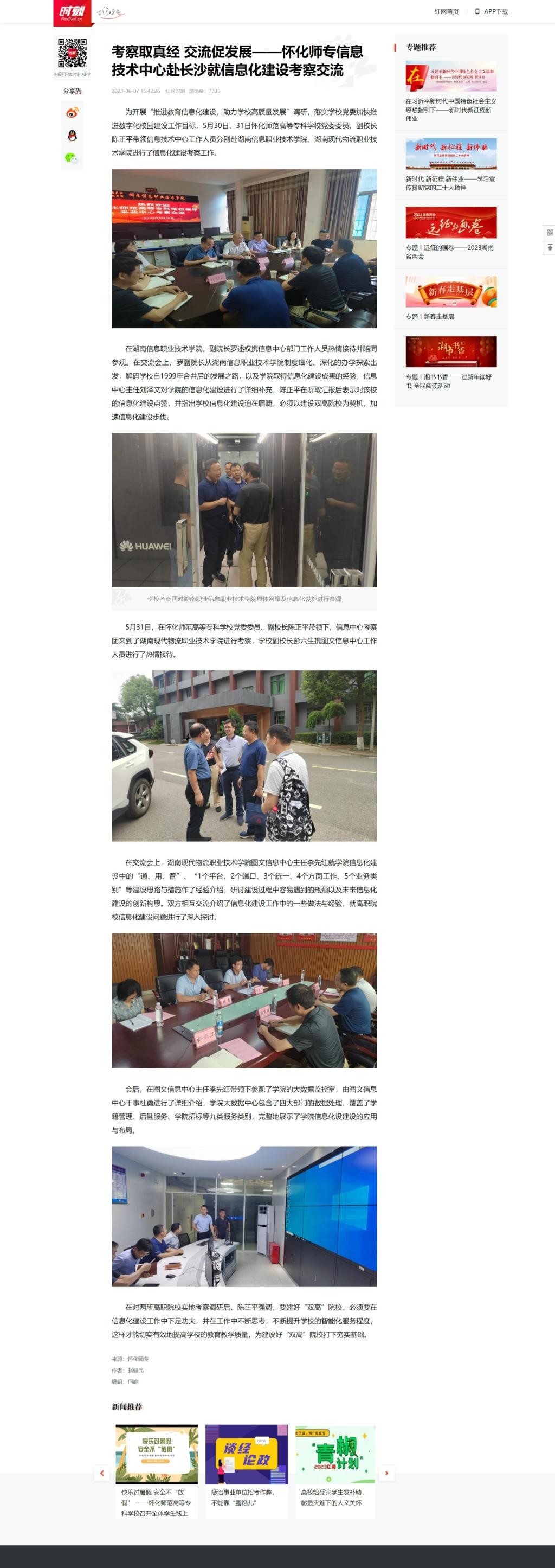 6月7日,红网发布《考察取真经 交流促发展——怀化师专信息技术中心赴长沙就信息化建设考察交流》