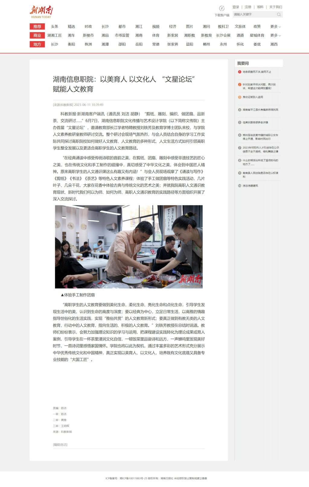 6月11日,新湖南发布《湖南信息职院:以美育人 以文化人 “文星论坛”赋能人文教育》