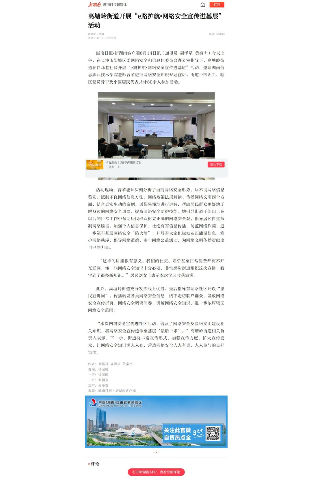 6月14日,新湖南客户端发布《高塘岭街道开展“e路护航•网络安全宣传进基层”活动》