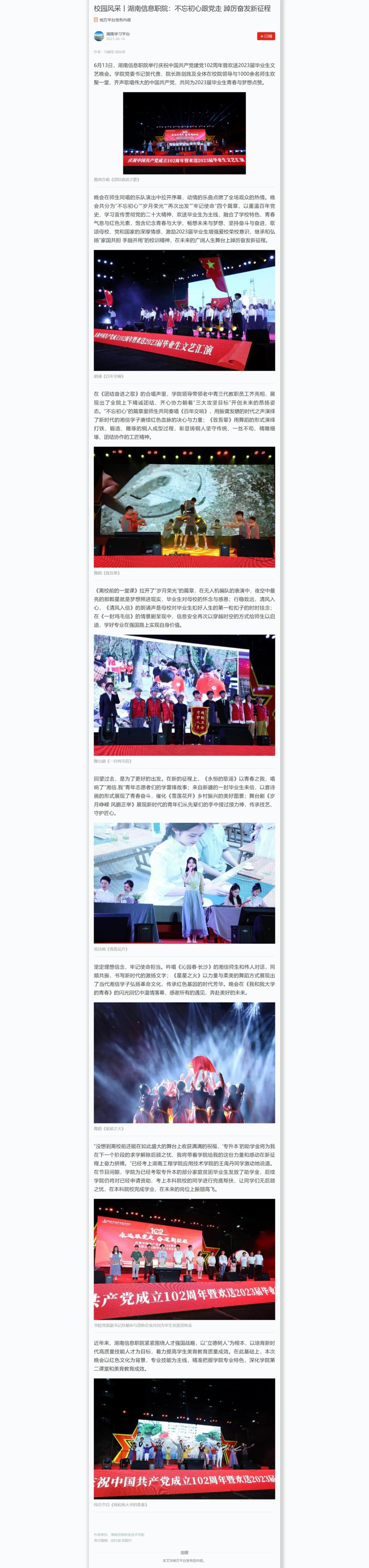 6月16日,学习强国发布《校园风采丨湖南信息职院:不忘初心跟党走 踔厉奋发新征程》