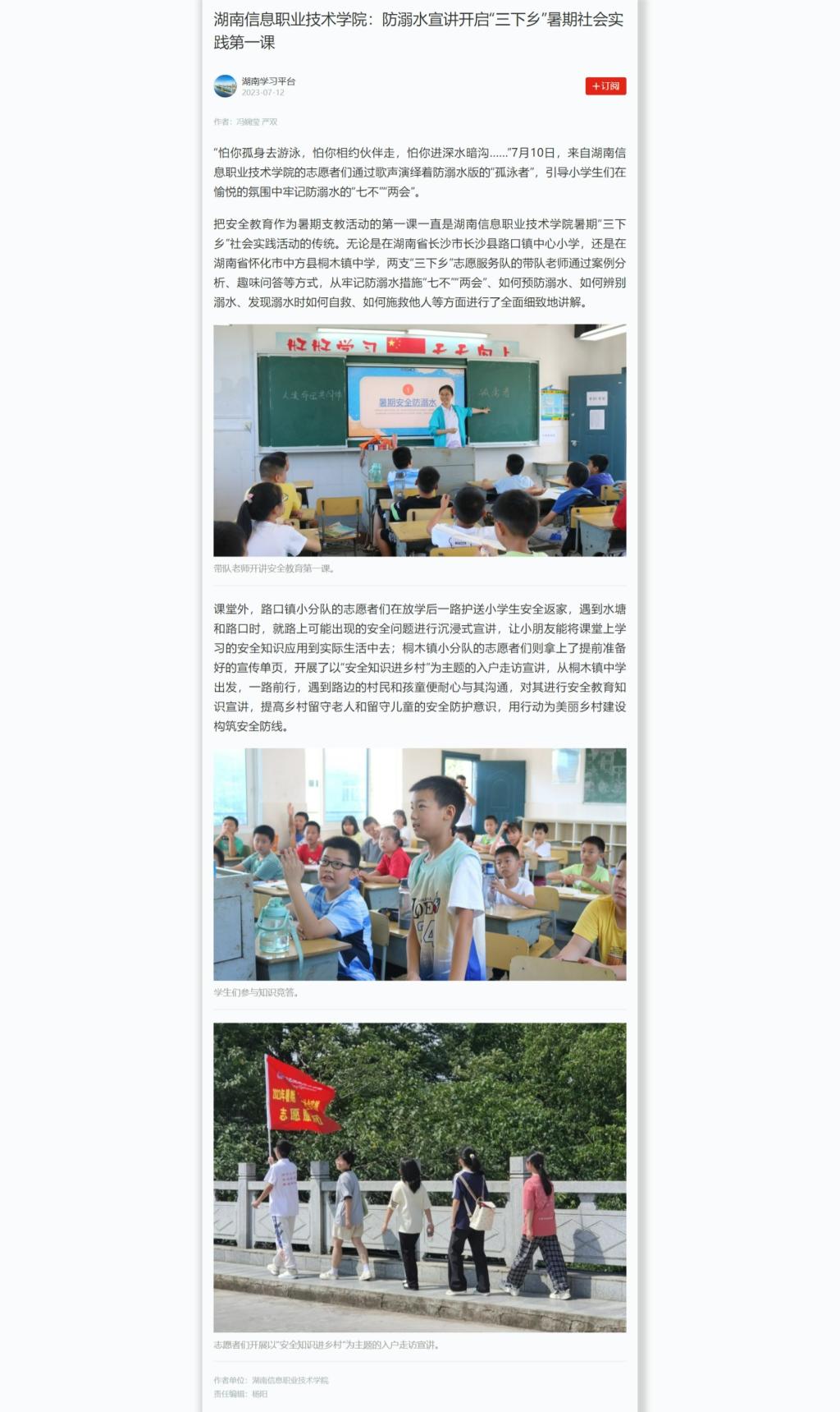 7月12日,学习强国发布《beat365官方网站:防溺水宣讲开启“三下乡”暑期社会实践第一课》