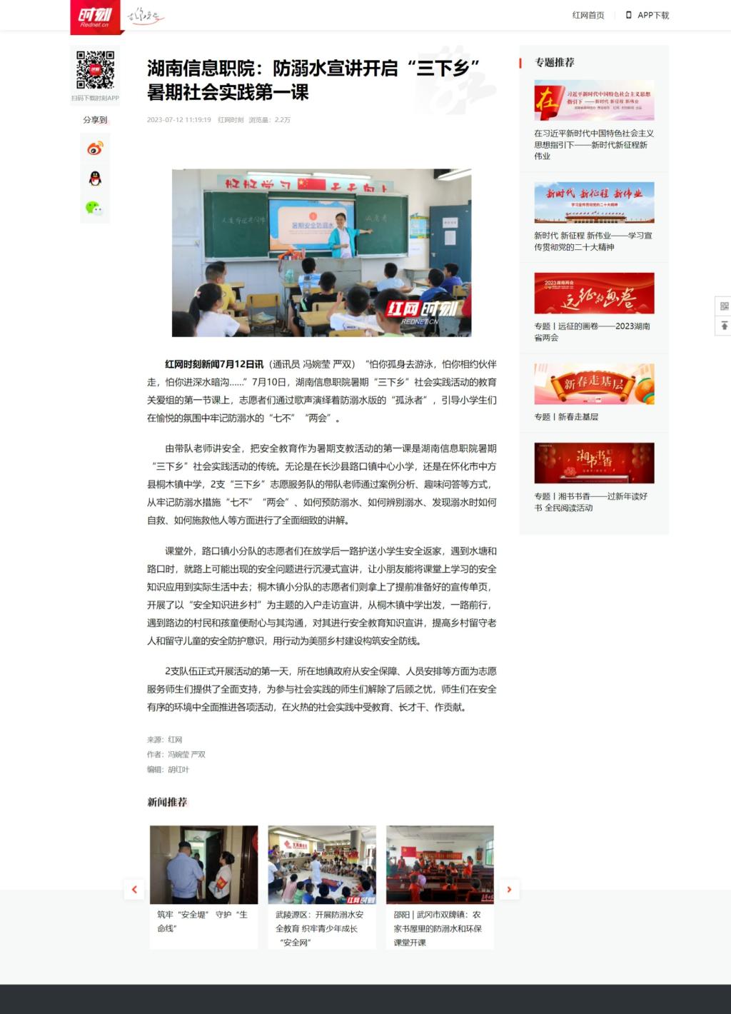 7月12日,红网发布《湖南信息职院:防溺水宣讲开启“三下乡”暑期社会实践第一课》