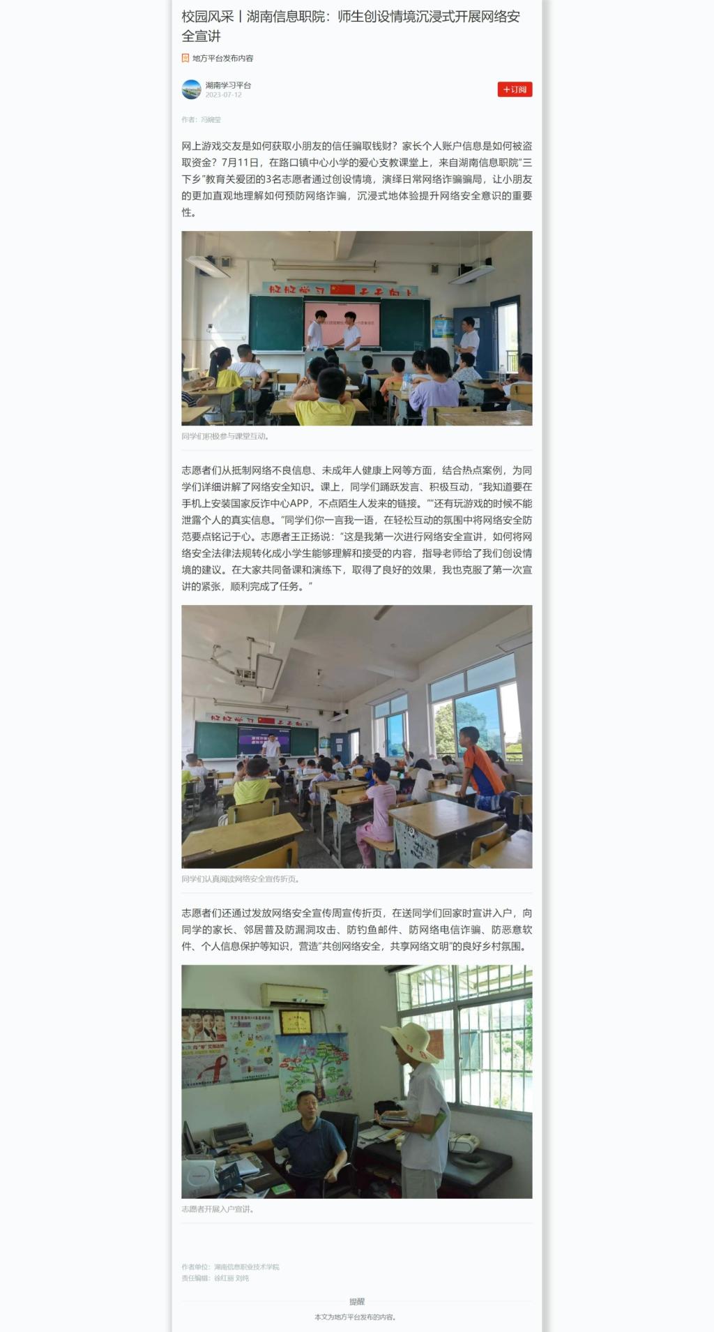 7月12日,学习强国发布《校园风采丨湖南信息职院:师生创设情境沉浸式开展网络安全宣讲》