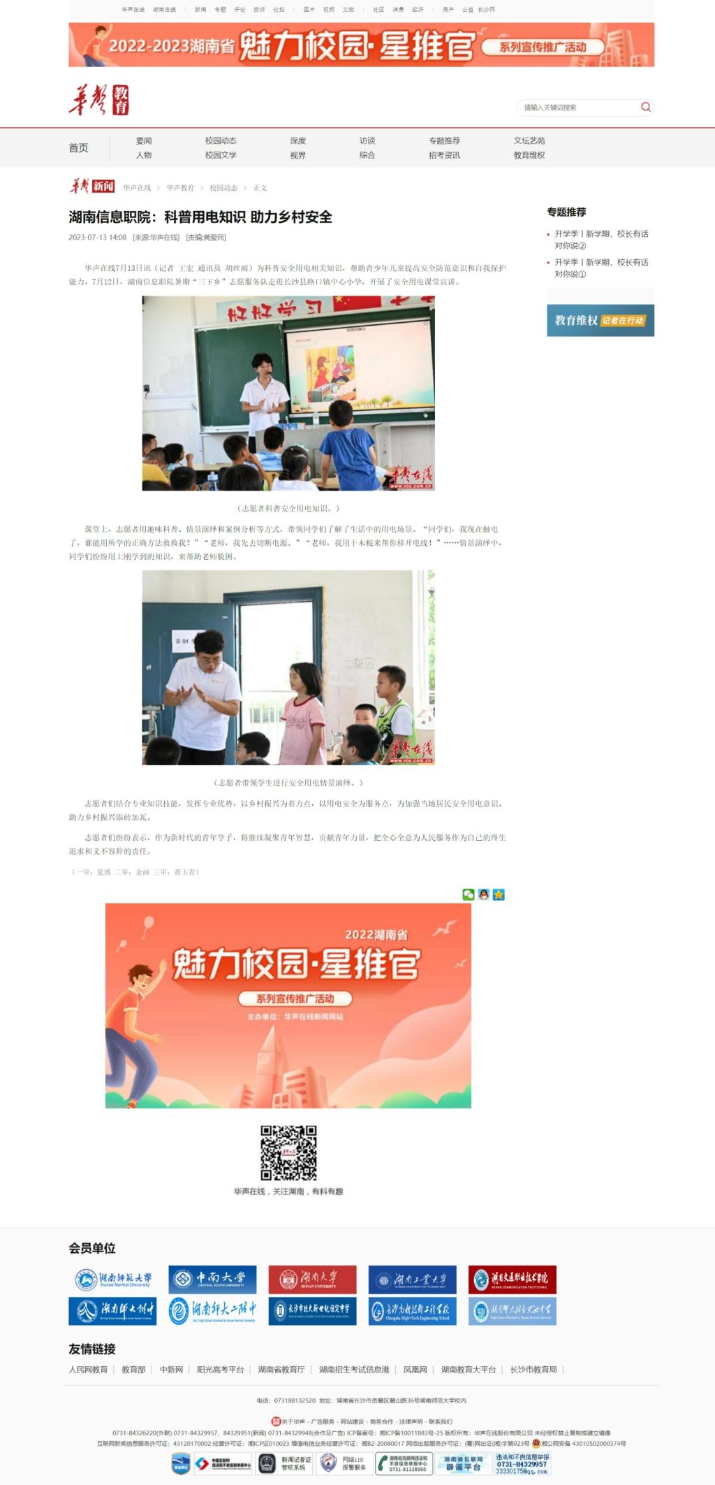 7月13日,华声在线发布《湖南信息职院:科普用电知识 助力乡村安全》