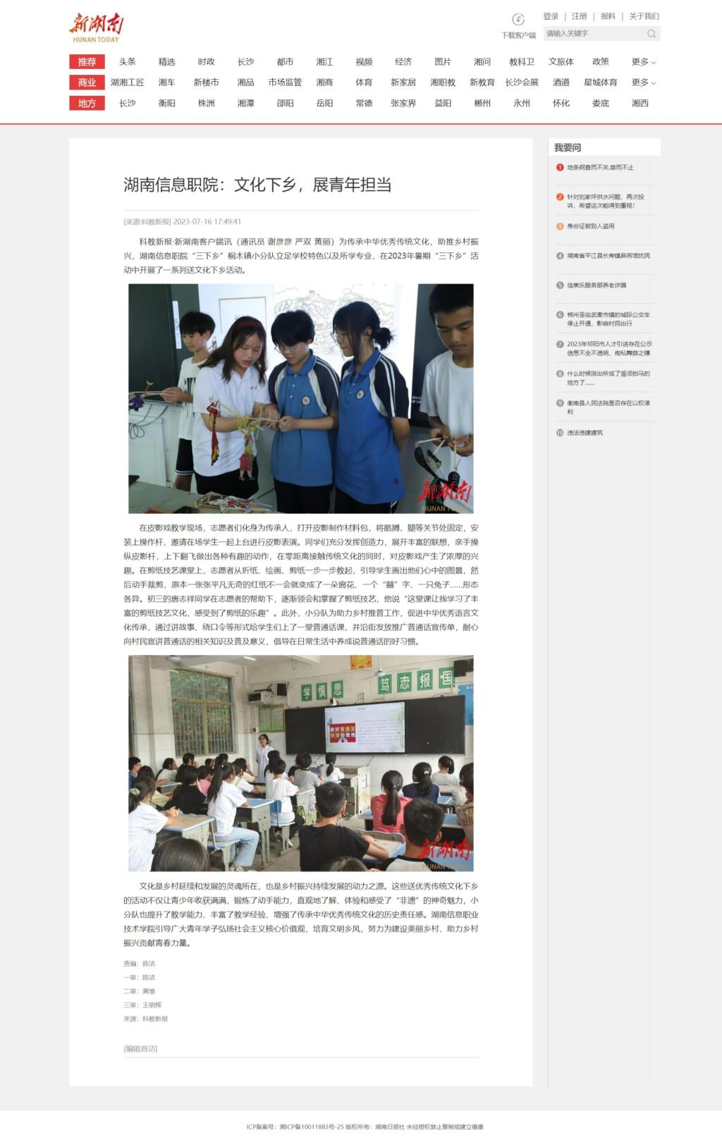 7月16日,新湖南发布《湖南信息职院:文化下乡,展青年担当》
