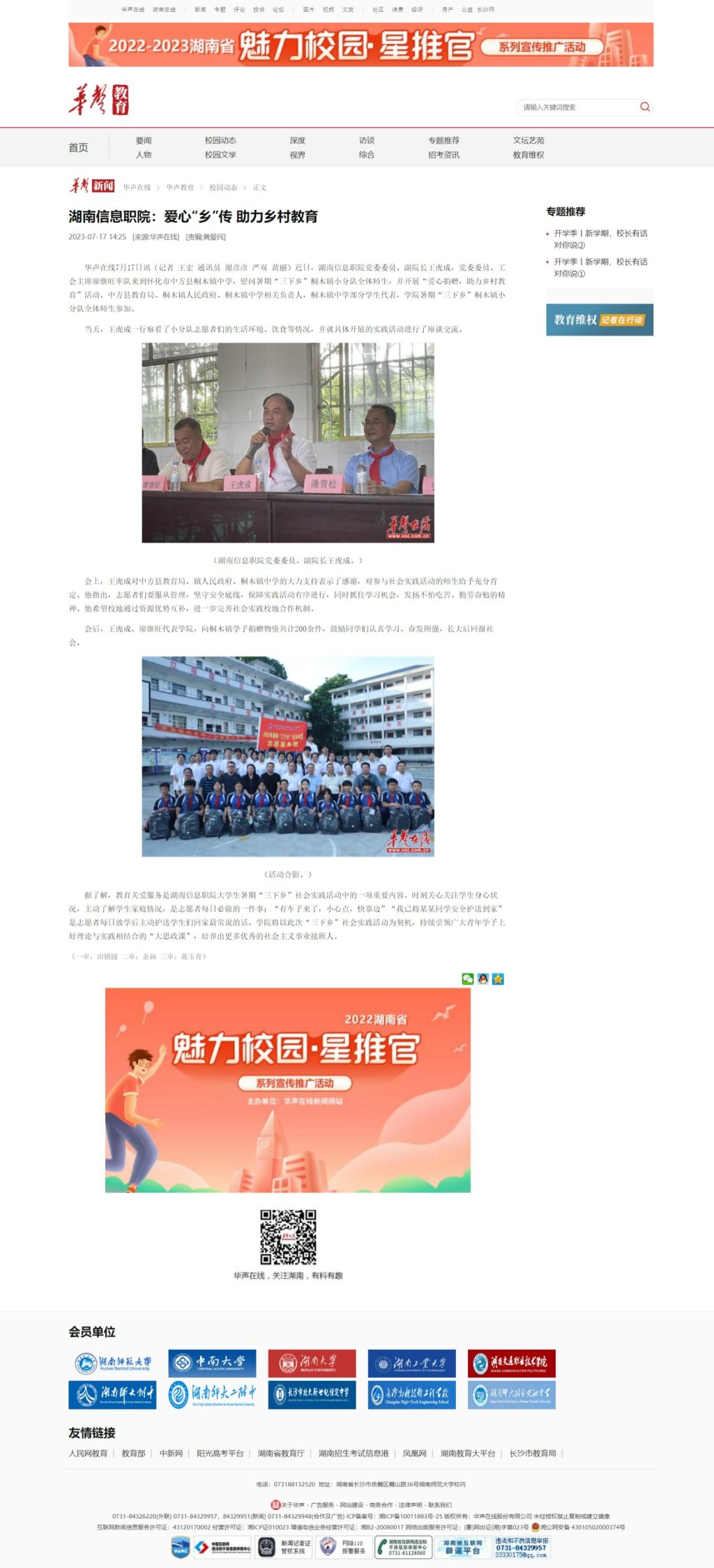 7月17日,华声在线发布《湖南信息职院:爱心“乡”传 助力乡村教育》