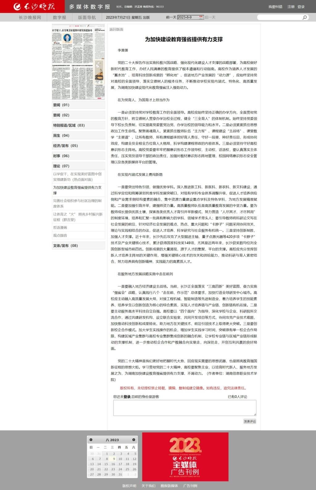7月21日,长沙晚报发布《为加快建设教育强省提供有力支撑》