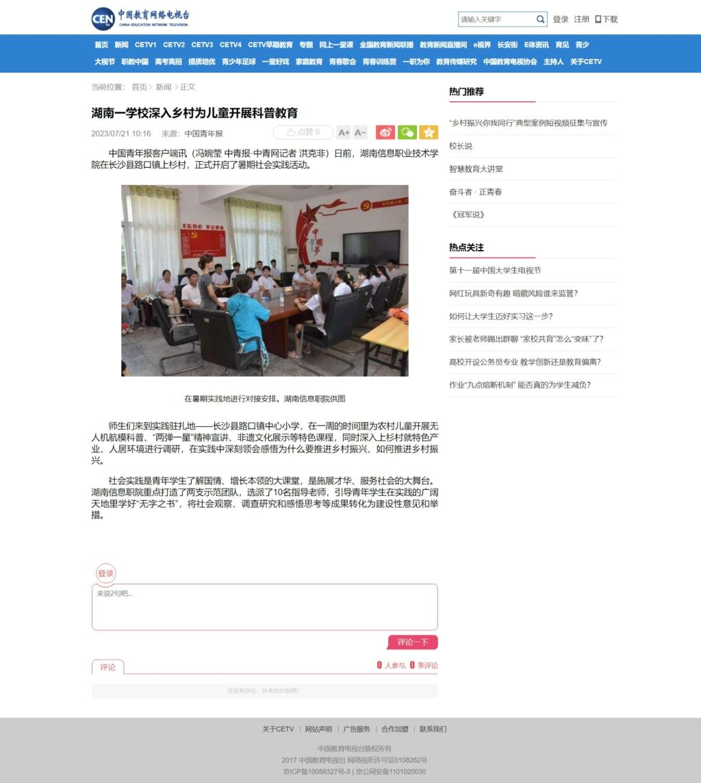 7月21日,中国教育网络电视台发布《湖南一学校深入乡村为儿童开展科普教育》