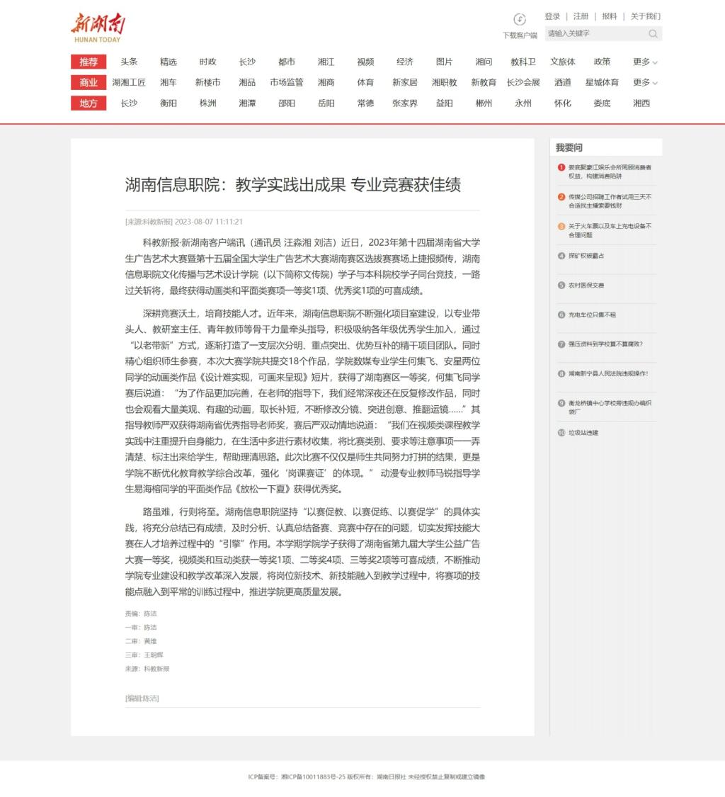8月4日,新湖南发布《湖南信息职院:教学实践出成果 专业竞赛获佳绩》