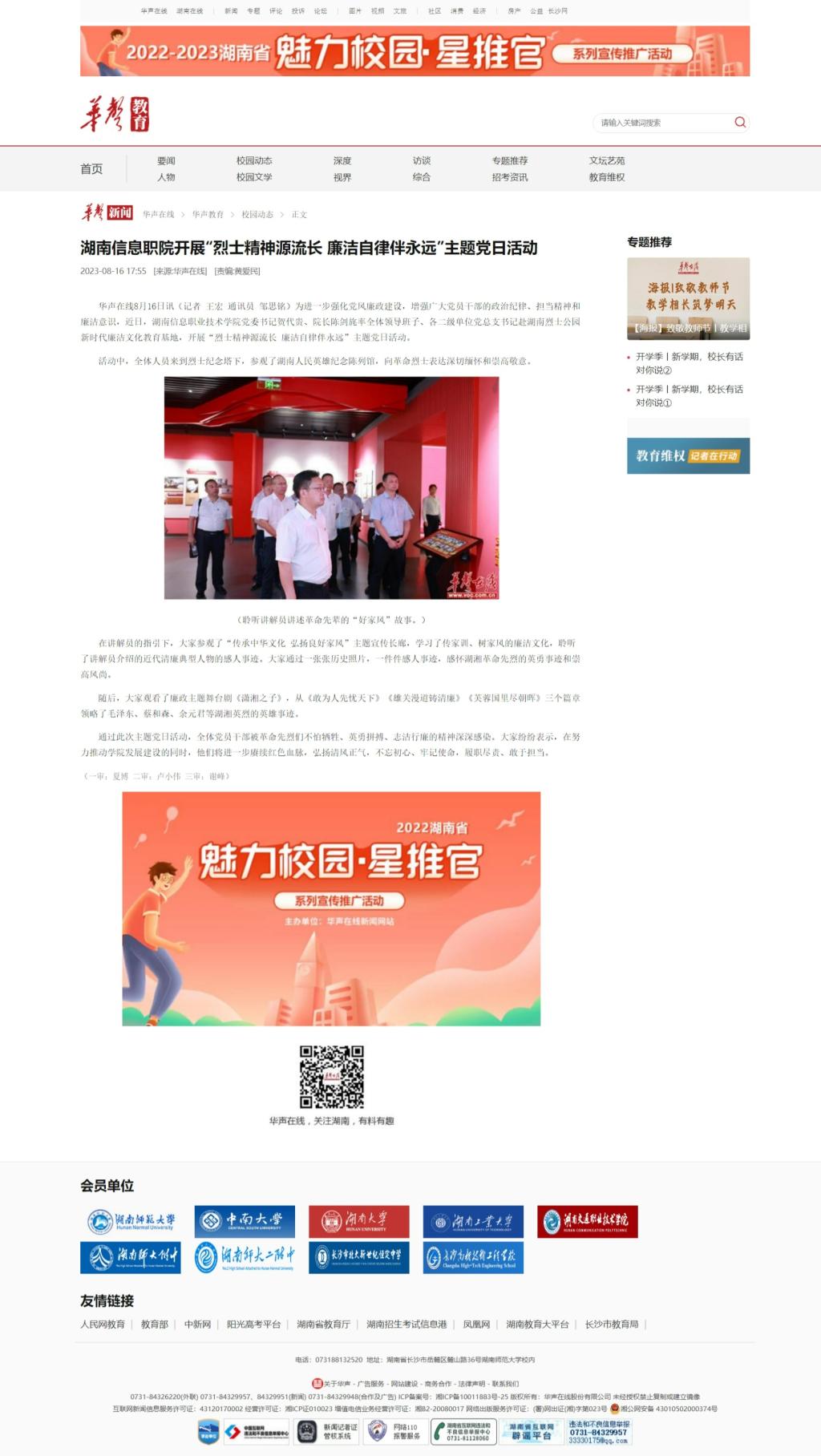 8月16日,华声在线发布《湖南信息职院开展“烈士精神源流长 廉洁自律伴永远”主题党日活动》