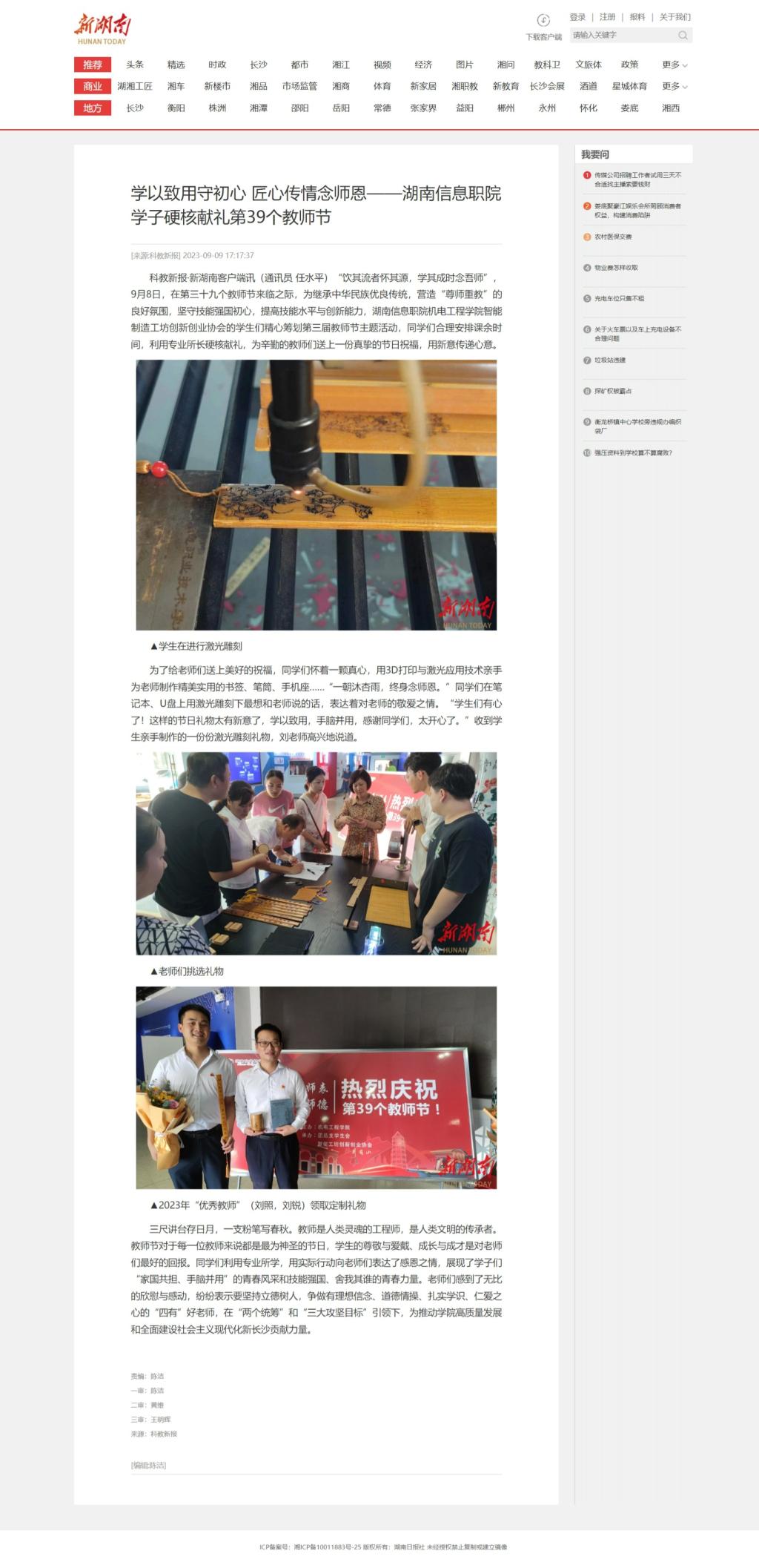9月9日,新湖南发布《学以致用守初心 匠心传情念师恩——湖南信息职院学子硬核献礼第39个教师节》