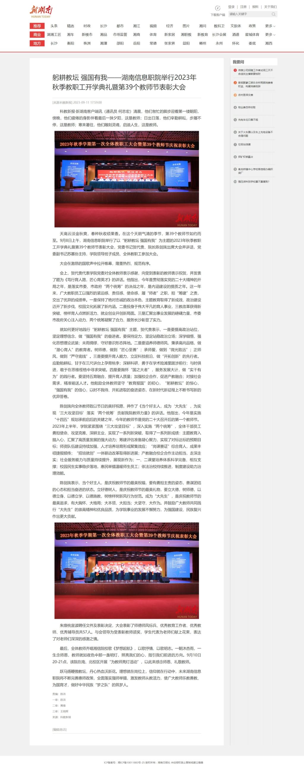 9月11日,新湖南发布《躬耕教坛 强国有我——湖南信息职院举行2023年秋季教职工开学典礼暨第39个教师节表彰大会》