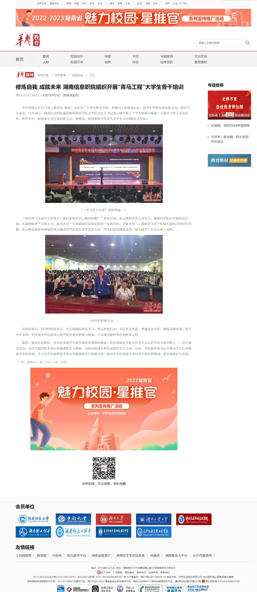 11月17日,华声在线发布《修炼自我 成就未来 湖南信息职院组织开展“青马工程”大学生骨干培训》