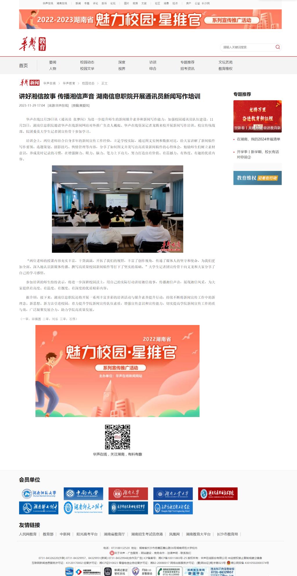 11月29日,华声在线发布《讲好湘信故事 传播湘信声音 湖南信息职院开展通讯员新闻写作培训》