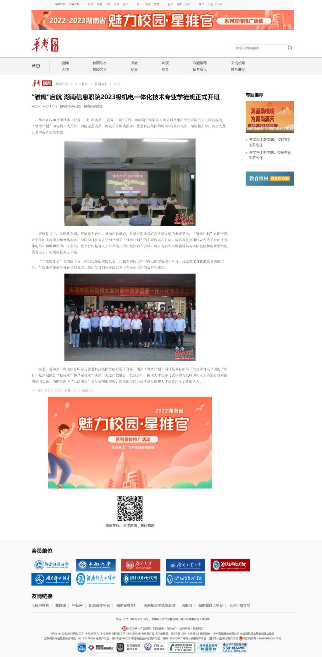 10月20日,华声在线发布《“雏鹰”启航 湖南信息职院2023级机电一体化技术专业学徒班正式开班》