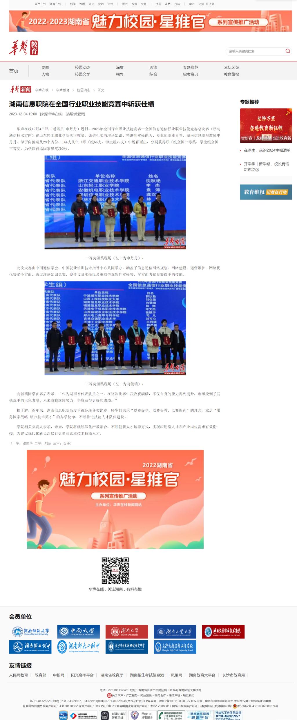 12月4日,华声在线发布《湖南信息职院在全国行业职业技能竞赛中斩获佳绩》