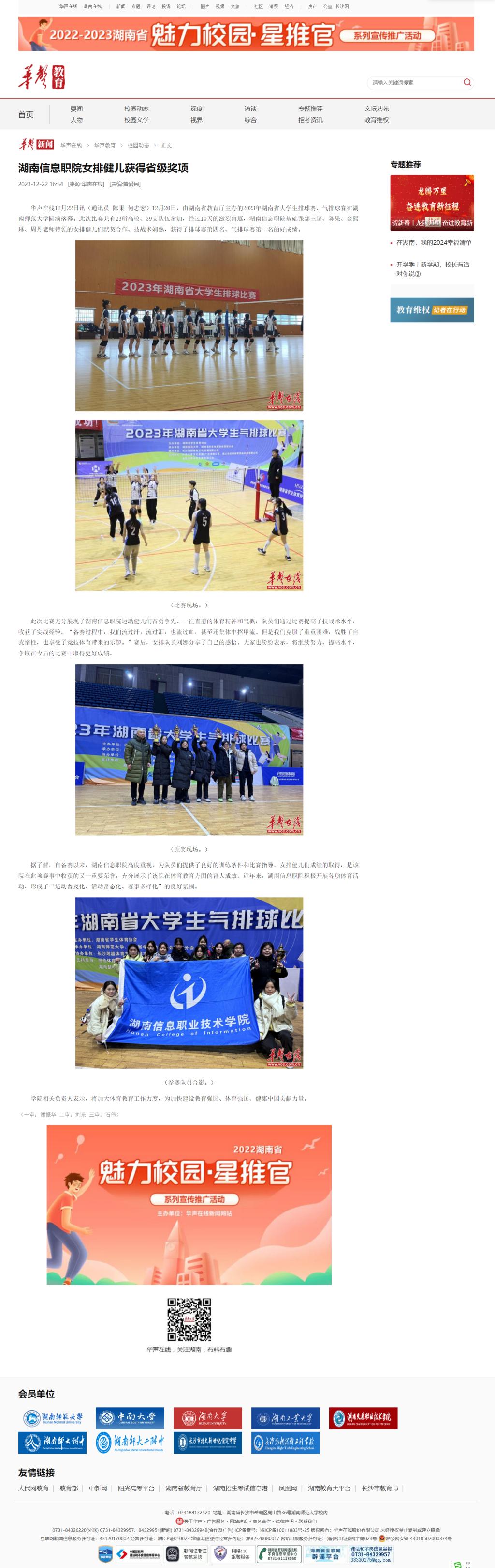 12月22日,华声在线发布《湖南信息职院女排健儿获得省级奖项》
