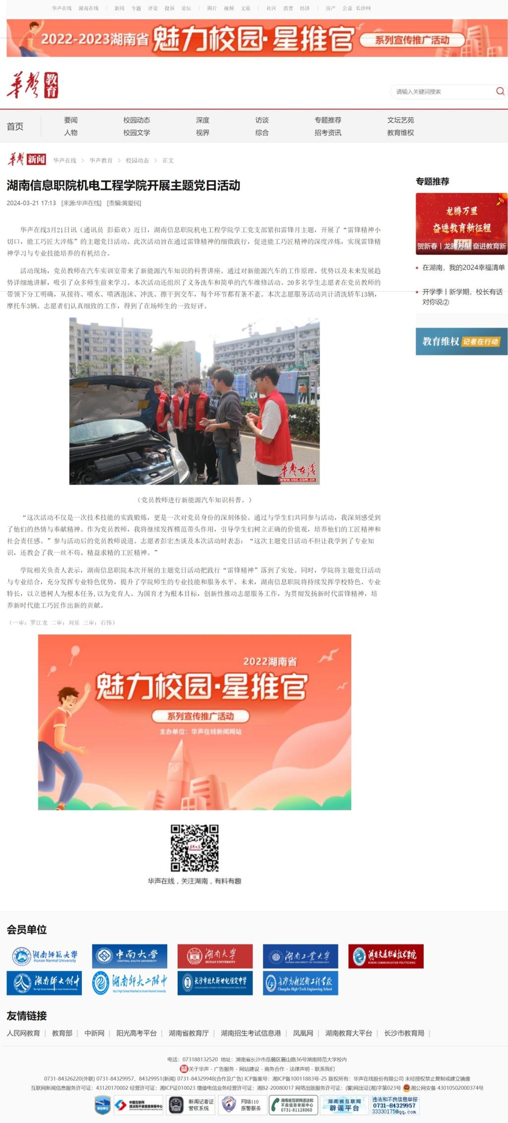 3月21日,华声在线发布《湖南信息职院机电工程学院开展主题党日活动》