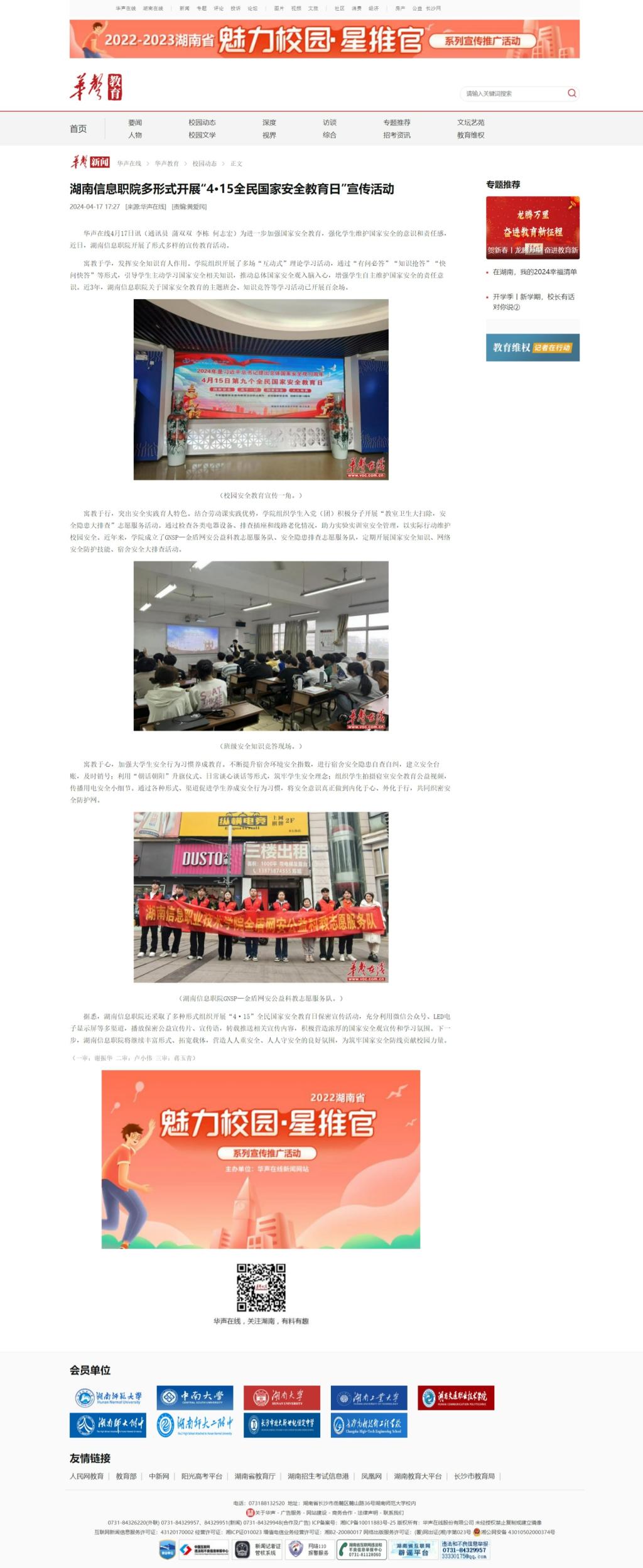 4月17日,华声在线发布《湖南信息职院多形式开展“4·15全民国家安全教育日”宣传活动》