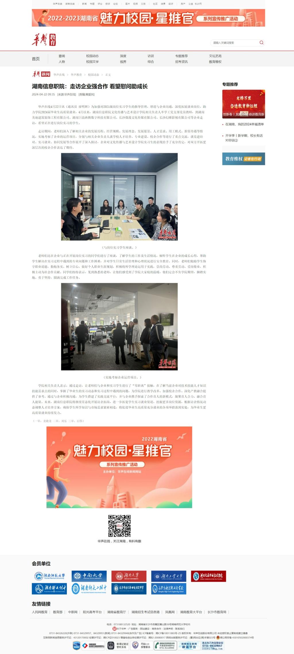4月22日,华声在线发布《湖南信息职院:走访企业强合作 看望慰问助成长》