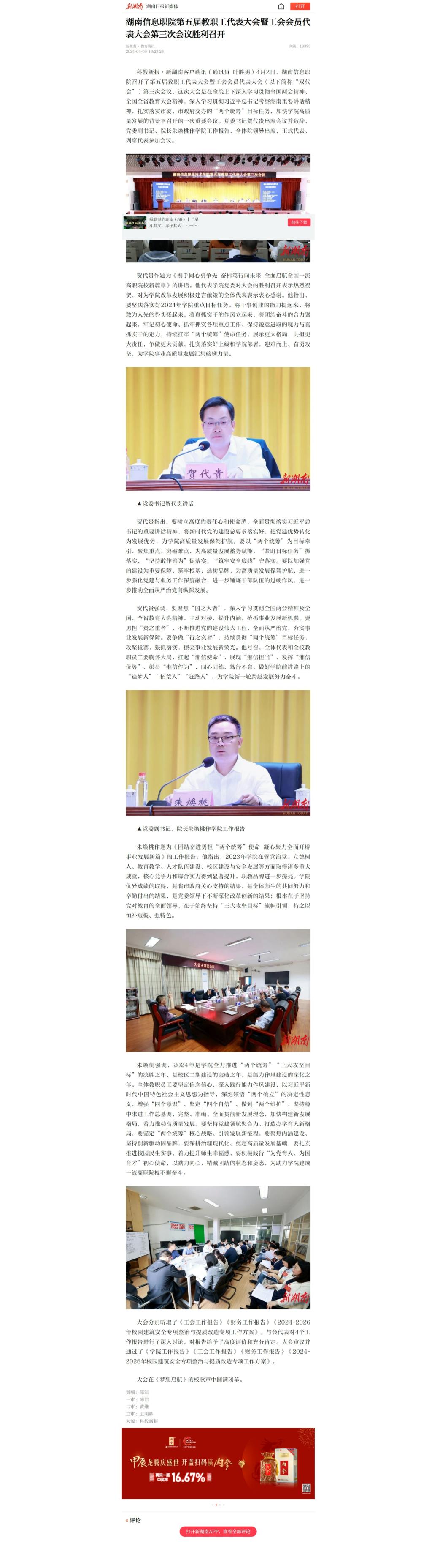 4月9日,新湖南发布《湖南信息职院第五届教职工代表大会暨工会会员代表大会第三次会议胜利召开》