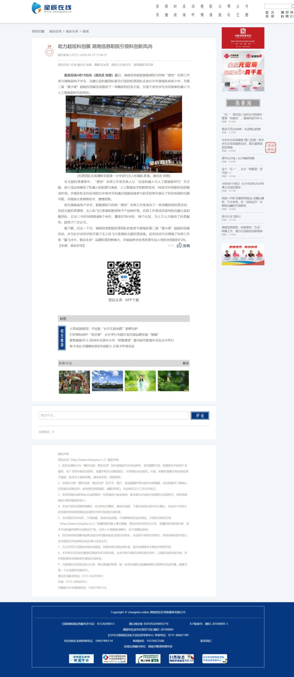 4月19日,星辰在线发布《助力超炫科创展 湖南信息职院引领科创新风尚》