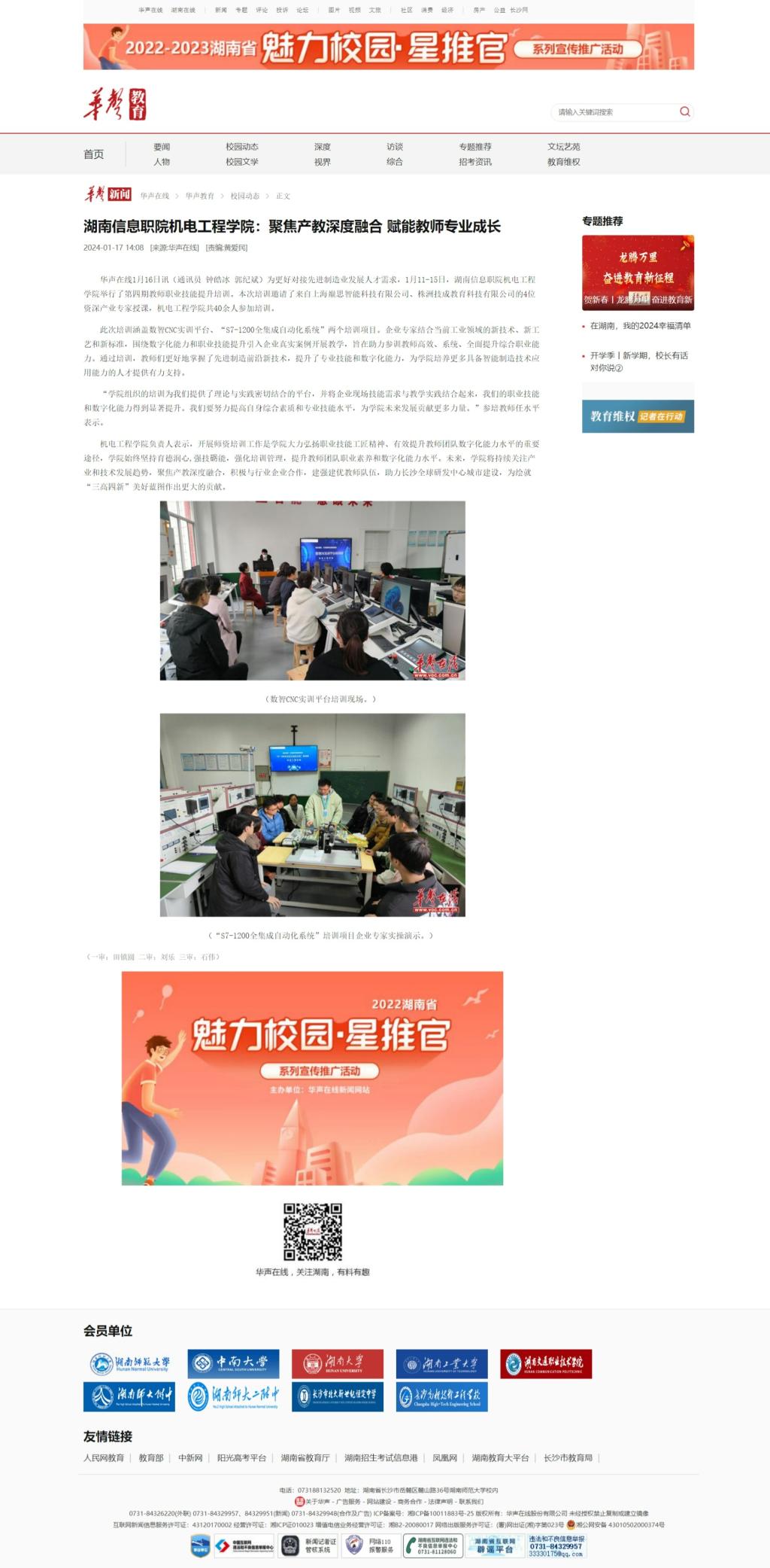 1月17日,华声在线发布《湖南信息职院机电工程学院:聚焦产教深度融合 赋能教师专业成长》