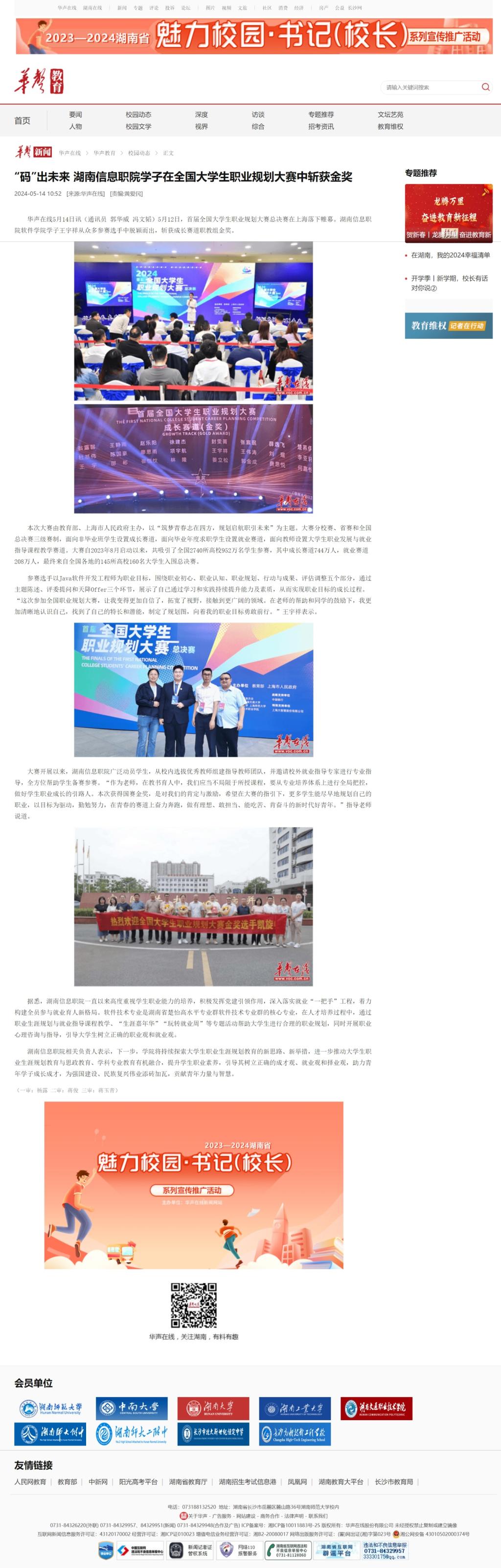5月14日,华声在线发布《“码”出未来 湖南信息职院学子在全国大学生职业规划大赛中斩获金奖》。