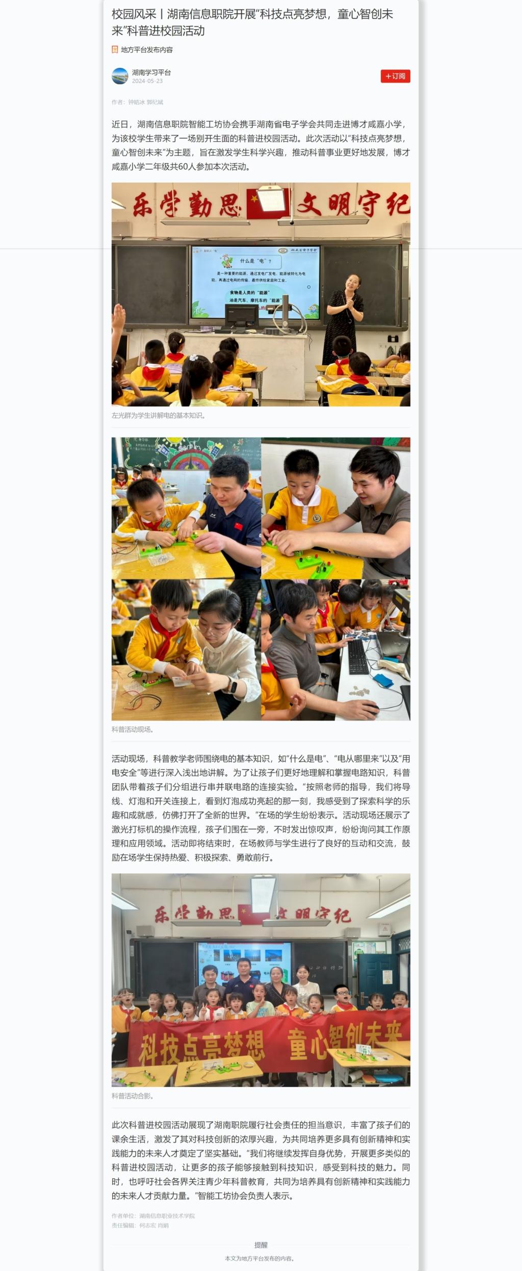 5月23日,学习强国发布《校园风采丨湖南信息职院开展“科技点亮梦想,童心智创未来”科普进校园活动》。