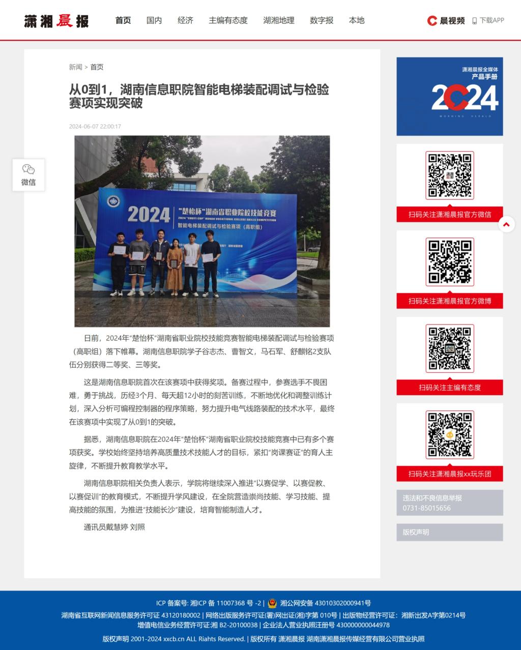 6月7日,潇湘晨报网发布《从0到1,湖南信息职院智能电梯装配调试与检验赛项实现突破》