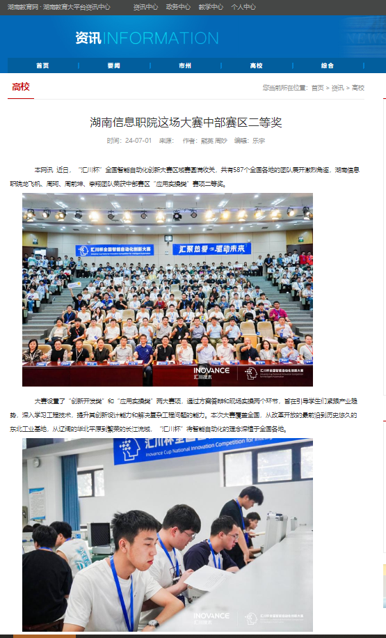 7月1日,湖南教育网发布《湖南信息职院这场大赛中部赛区二等奖》
