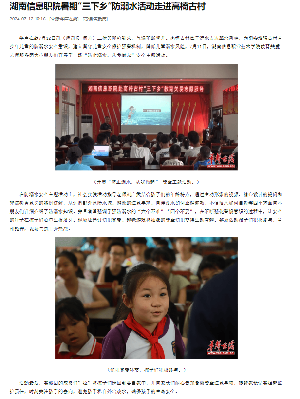 7月12日,华声在线发布《湖南信息职院暑期“三下乡”防溺水活动走进高椅古村》