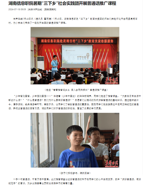 7月18日,华声在线发布《湖南信息职院暑期“三下乡”社会实践团开展普通话推广课程》