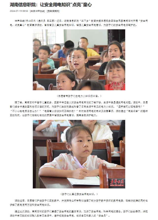 7月19日,华声在线发布《湖南信息职院:让安全用电知识“点亮”童心》