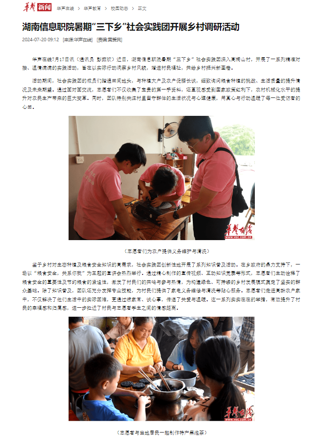 7月20日,华声在线发布《湖南信息职院暑期“三下乡”社会实践团开展乡村调研活动》