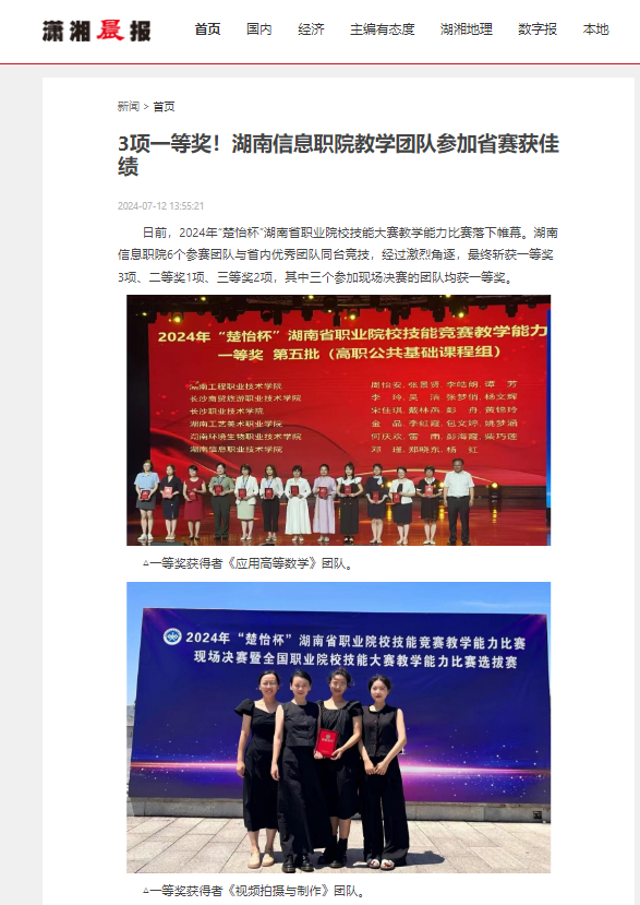 7月12日,潇湘晨报发布《3项一等奖!湖南信息职院教学团队参加省赛获佳绩》