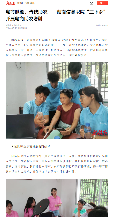 7月16日,新湖南发布《电商赋能,传技助农——湖南信息职院“三下乡”开展电商助农培训》