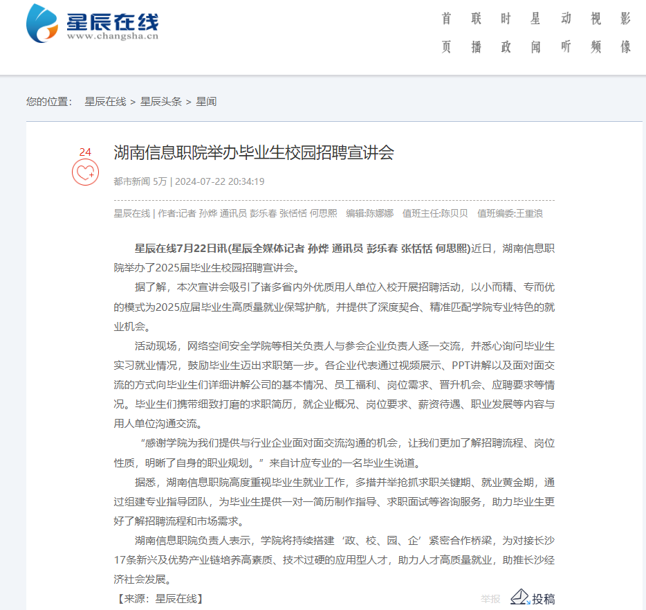 7月22日,星辰在线发布《湖南信息职院举办毕业生校园招聘宣讲会》