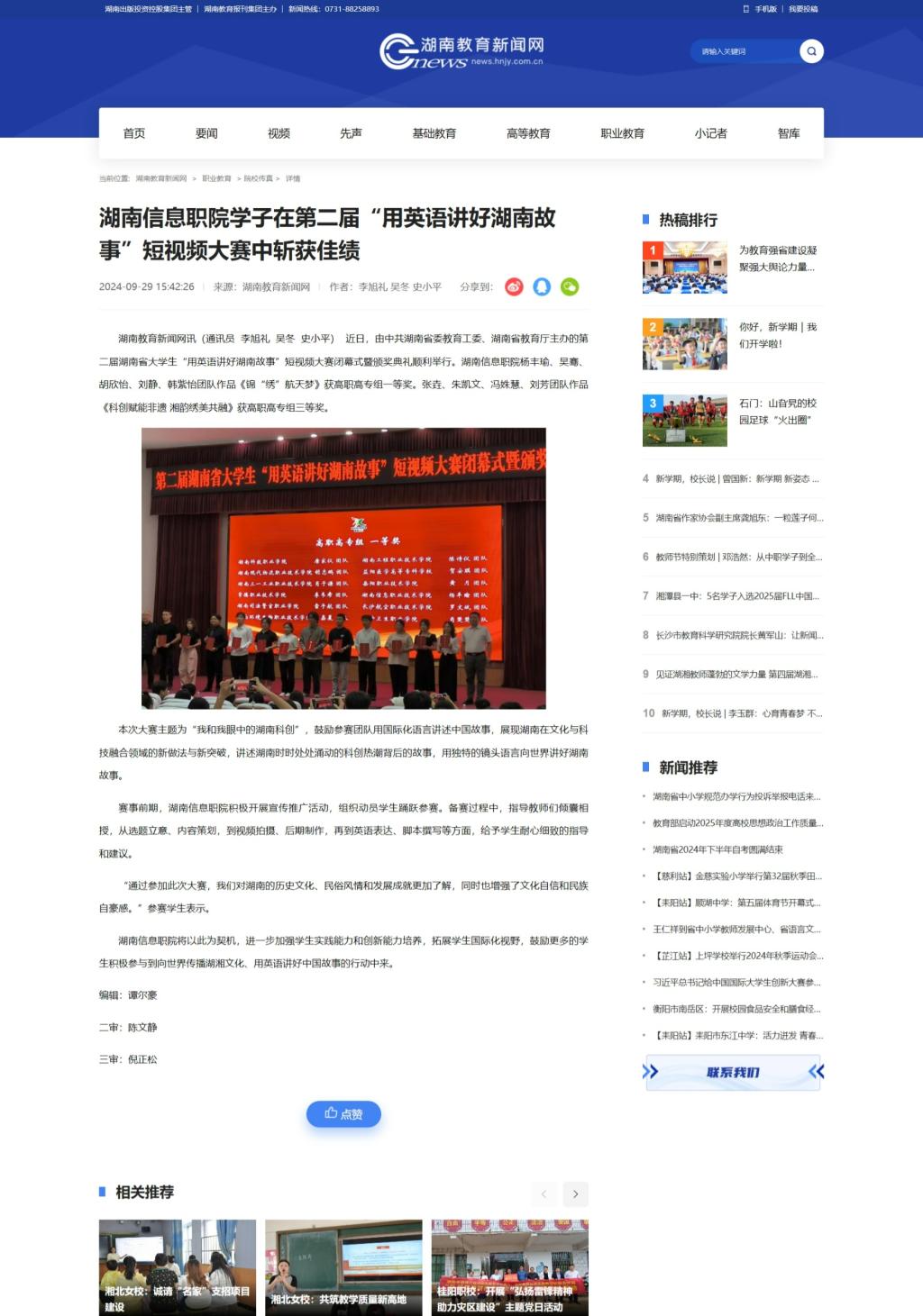 9月29日,湖南教育新闻网发布《湖南信息职院学子在第二届“用英语讲好湖南故事”短视频大赛中斩获佳绩》