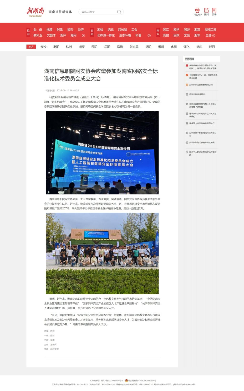 9月14日,新湖南发布《湖南信息职院网安协会应邀参加湖南省网络安全标准化技术委员会成立大会》