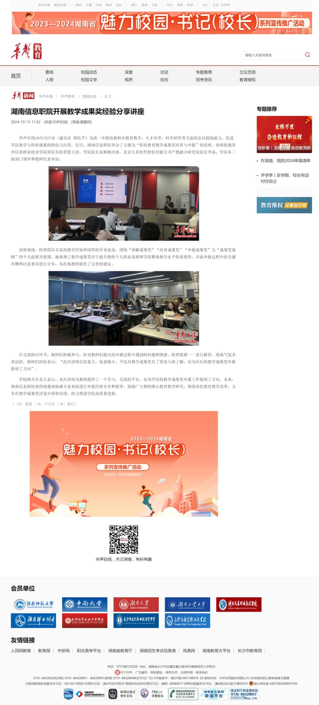 10月15日,华声在线发布《湖南信息职院开展教学成果奖经验分享讲座》