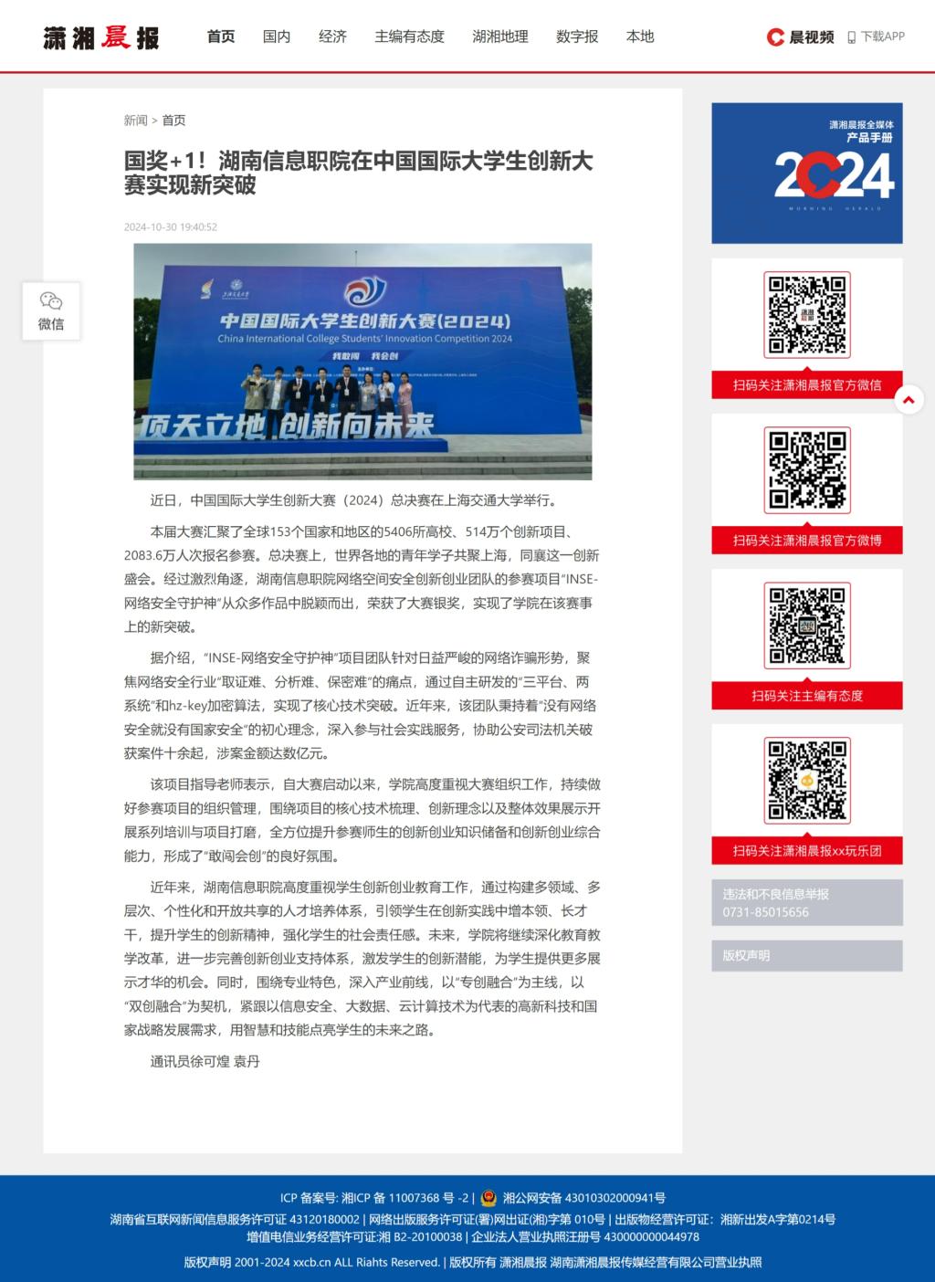10月30日,潇湘晨报网发布《国奖+1!湖南信息职院在中国国际大学生创新大赛实现新突破》