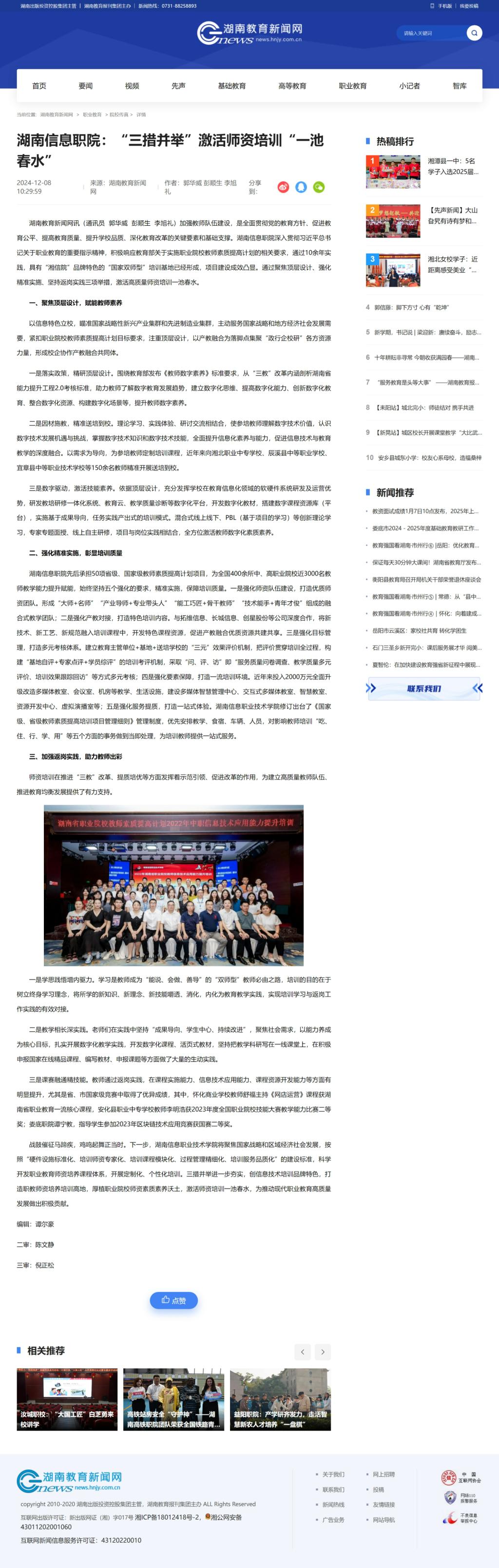 12月8日,湖南教育新闻网发布《湖南信息职院:“三措并举”激活师资培训“一池春水”》