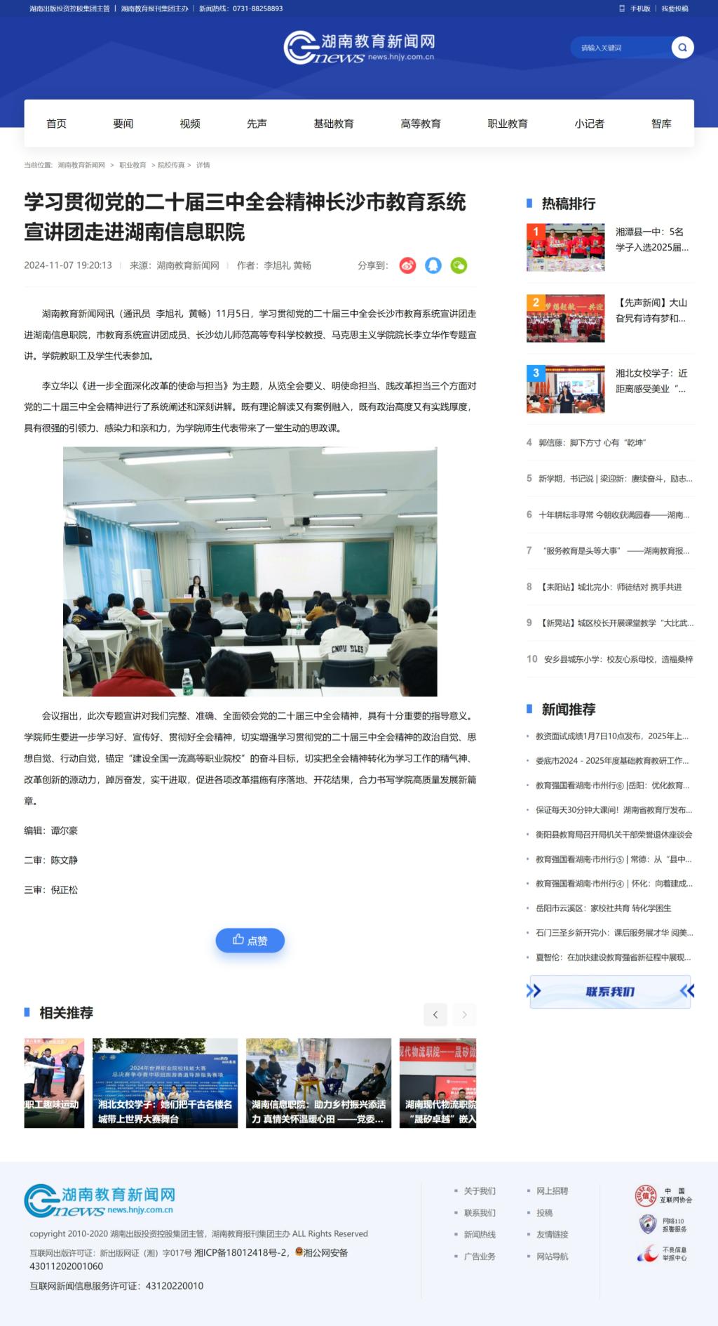 11月7日,湖南教育新闻网发布《学习贯彻党的二十届三中全会精神长沙市教育系统宣讲团走进湖南信息职院》
