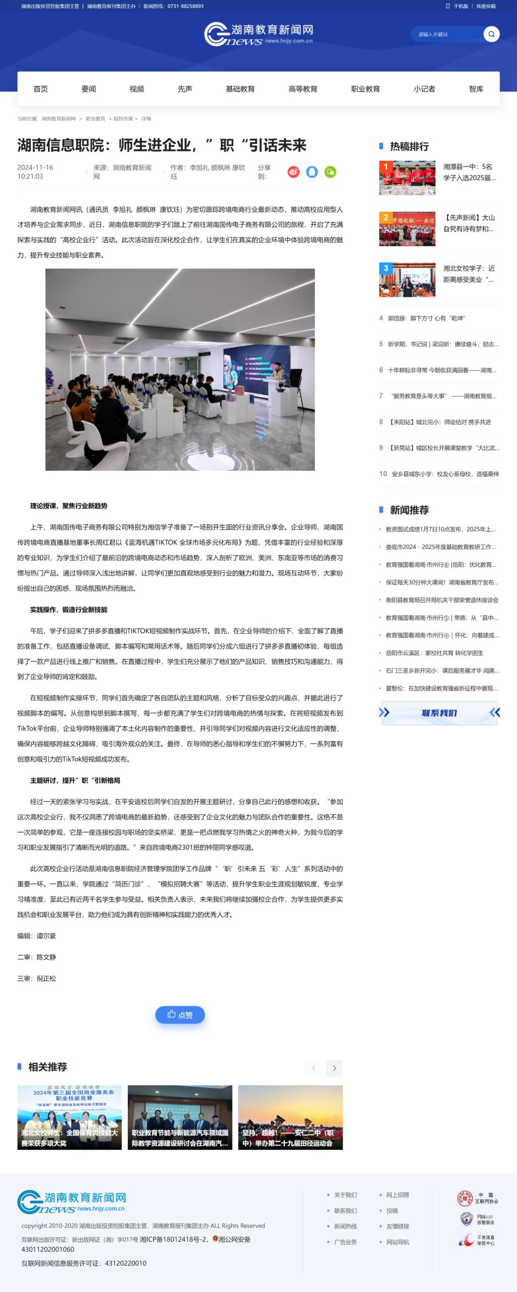 11月16日,湖南教育新闻网发布《湖南信息职院:师生进企业,“职”引话未来》