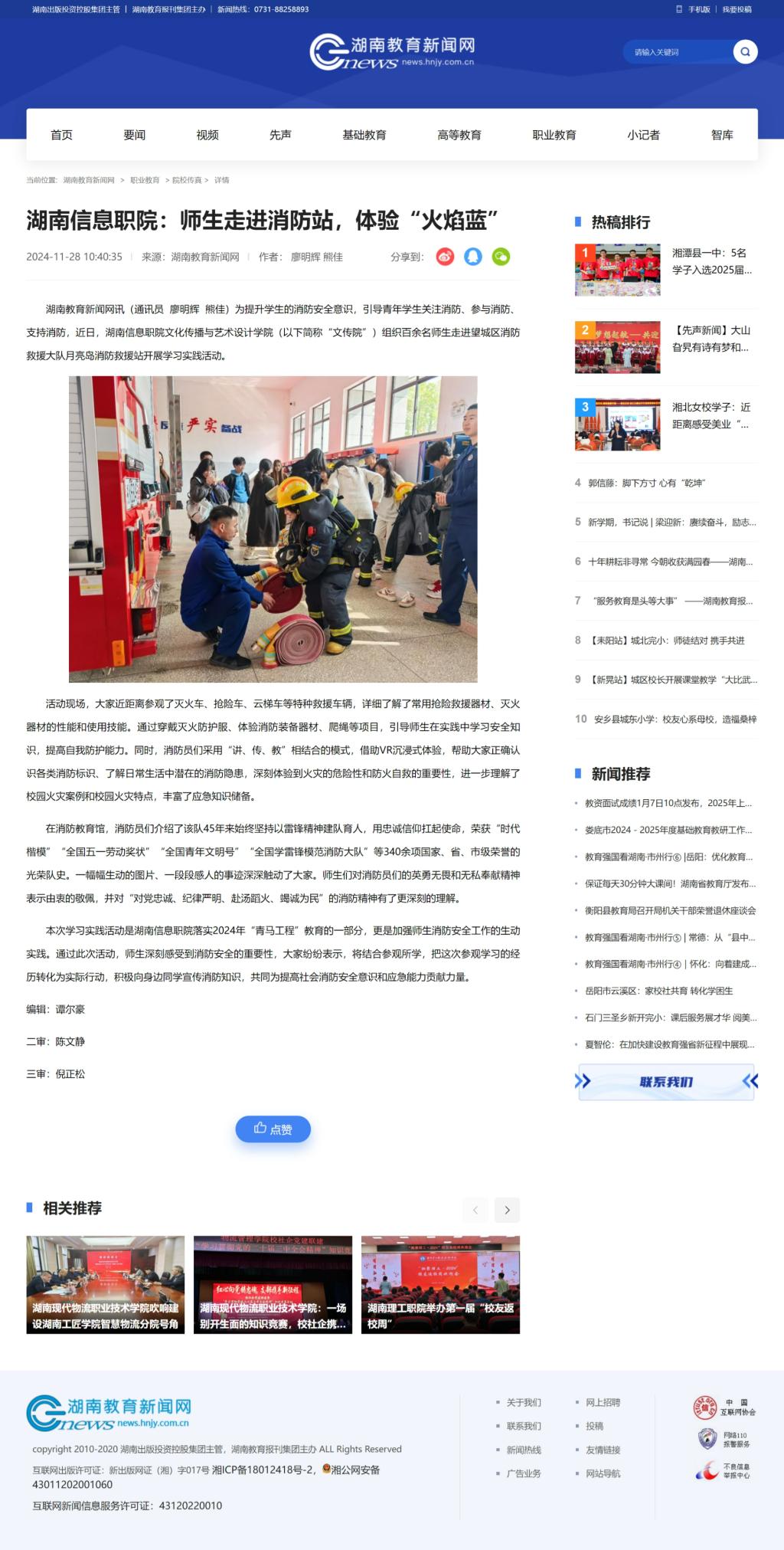 11月28日,湖南教育新闻网发布《湖南信息职院:师生走进消防站,体验“火焰蓝”》