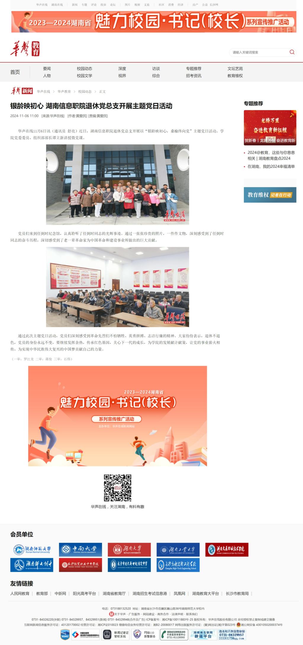 11月6日,华声在线发布《银龄映初心 湖南信息职院退休党总支开展主题党日活动》