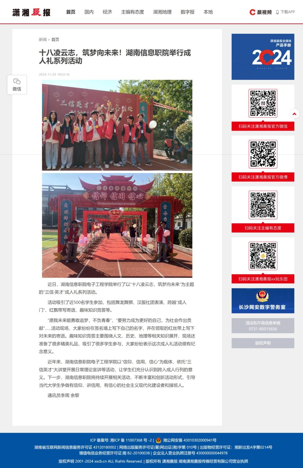 11月5日,潇湘晨报网发布《十八凌云志,筑梦向未来!湖南信息职院举行成人礼系列活动》
