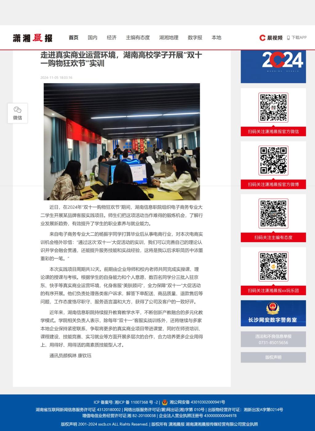 11月5日,潇湘晨报网发布《走进真实商业运营环境,湖南高校学子开展“双十一购物狂欢节”实训》