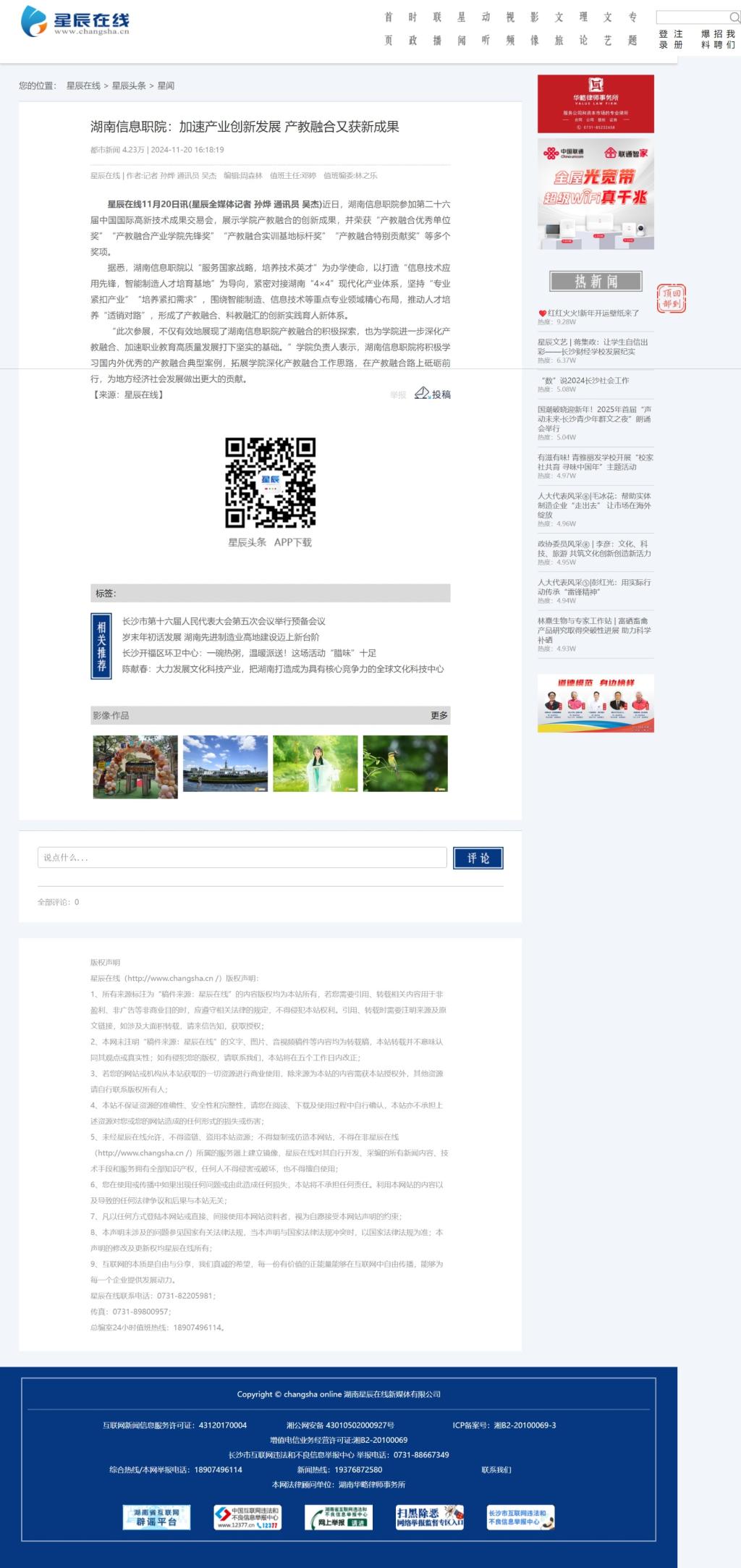 11月20日,星辰在线发布《湖南信息职院:加速产业创新发展 产教融合又获新成果》